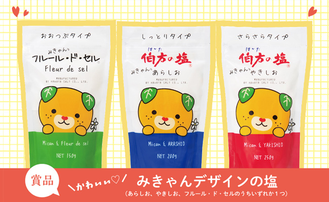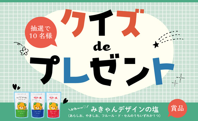 でお馴染みの伯方塩業では、『塩』にまつわるクイズやアンケートにお答え頂いた方の中から、抽選で10名様に<みきゃんデザインの塩>が当たる『クイズ de プレゼント』を実施中!
