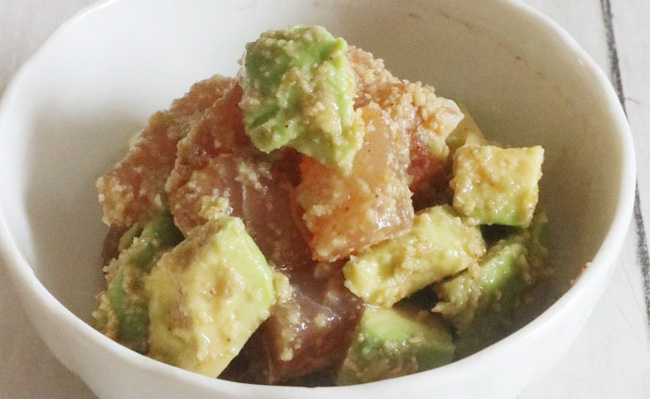 アボカドは縦半分に切り、種を外して皮を剥き、2㎝角に切ります。まぐろも2㎝角に切ります。