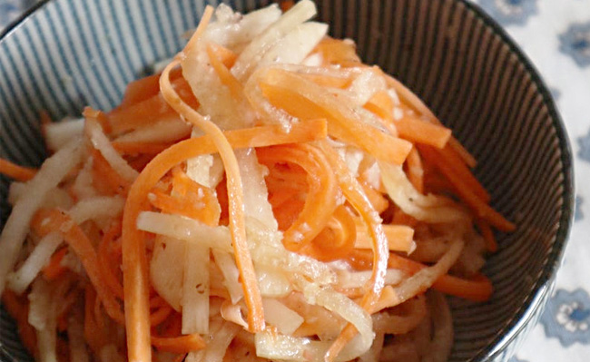 にんじんは皮を剥き、斜め薄切りにしてから千切りにします。大根は皮を剥き、にんじんと同じ長さの千切りにします。耐熱容器に入れ、ラップをかけて電子レンジ(600w)で2分加熱します。そのあと余熱を取り、水気を切ります。