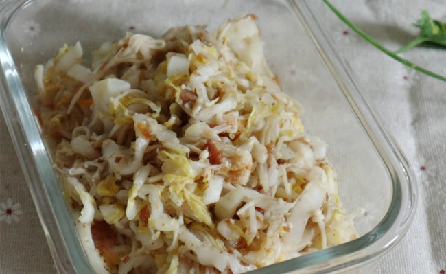 (1)を耐熱容器に入れ、ラップをかけて電子レンジ(600w)で4分加熱します。4分経ったら粗熱を取り、しっかり水気を切ります。