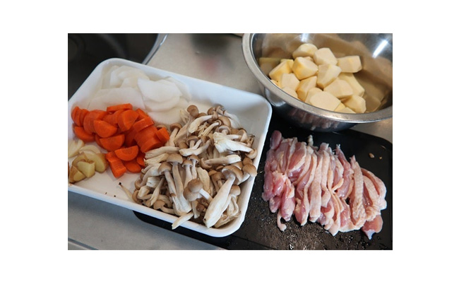 里芋は土がついている場合、しっかりと水洗いし、皮を剥いて大きめの一口サイズに切ります。にんじんは皮ごと縦半分に切り、厚めの半月切りにします。大根は皮を剥いて5㎜幅の半月切りに、しめじは石づきを外して手でほぐします。しょうがは皮ごと乱切りにします。にんにくは縦半分に切り、芽を取ります。鶏もも肉は5~8㎜幅程度の薄切りにします。