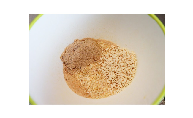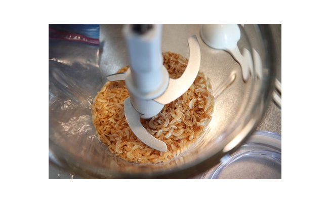 乾燥アミエビを粗い粒が少し残る程度になるまで、フードチョッパーにかけます。