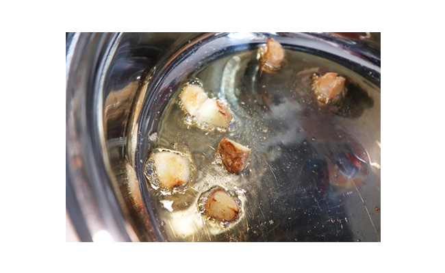 大きめの鍋に、ごま油、オリーブオイル、(1)のしょうが、にんにくを入れ、弱火にかけてゆっくりと香りを引き出します。