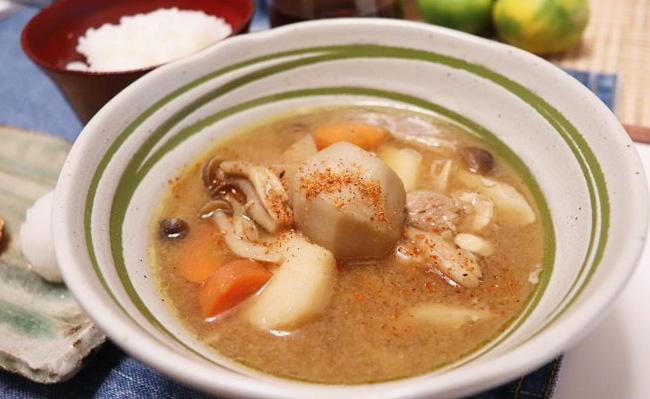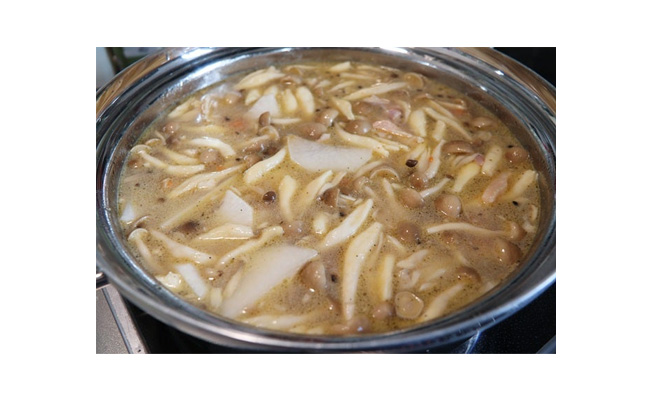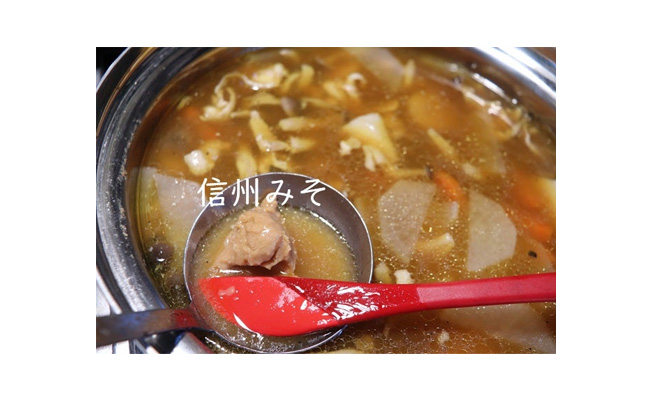 30分経ったら、醤油、信州味噌、うま味調味料を加え、だまにならないように溶かします。お好みで七味唐辛子を振って召し上がりください。