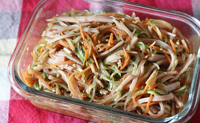 にんじんは皮を剥き、スライサーで千切りにします。きゅうりとハムはにんじんと同じ細さの千切りにします。