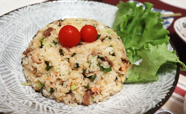 お皿にフリルレタスをセットします。(6)の焼きめしを半球になるようにボウルなどに入れ、レタスの上にひっくり返します。ミニトマトを飾ったら完成です。