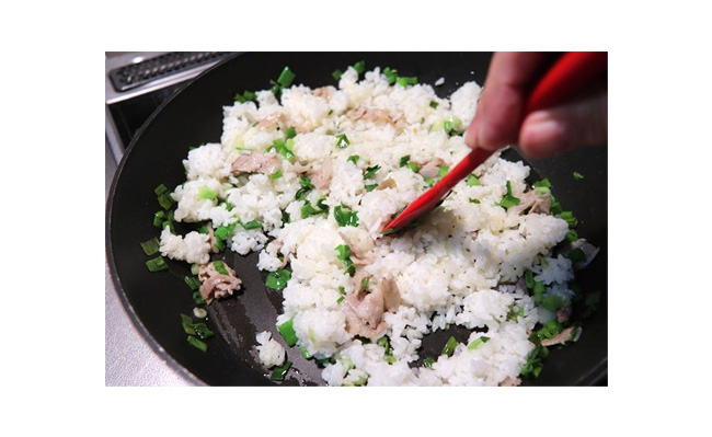 (2)に(1)の九条ねぎ、ごま油、ごはんを加え、ごはんが潰れないように、豚バラ肉の脂が絡むように炒めます。