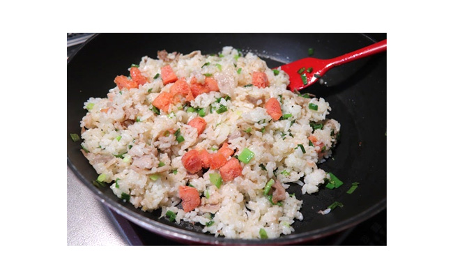 明太子が馴染んだら火を止め、残りの明太子を加えます。加えた明太子が崩れないように均等に混ぜたら、火をつけて中火にし、かき回さずにごはんの下面に焼き色が入るまで加熱します。パチパチと焼きが入る音に変わったら火を止めます。