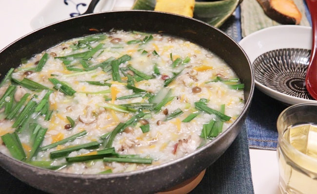 広めのフライパンに(1)と(にらは根元の3分の1のみ)、生米、◎を入れ、沸騰までは強火で、沸騰し始めたら弱火に下げ、蓋をしてゆっくりと1時間煮ます。