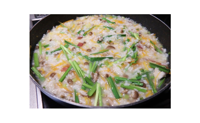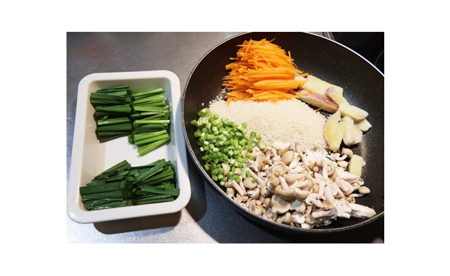 広めのフライパンに(1)と(にらは根元の3分の1のみ)、生米、◎を入れ、沸騰までは強火で、沸騰し始めたら弱火に下げ、蓋をしてゆっくりと1時間煮ます。