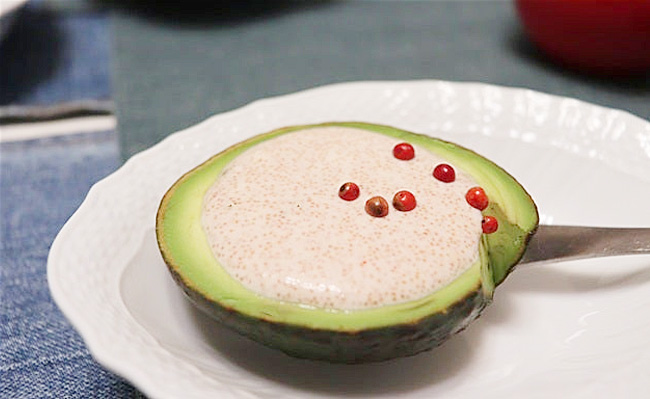 ボウルに(1)の明太子と◎を入れ、よく混ぜ合わせます。そのあと(1)のアボカドの種の部分に注ぎ、ピンクペッパーを散らしたら完成です。