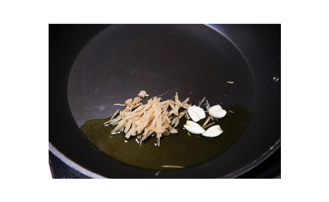 フライパンにオリーブオイル、(2)のしょうが、にんにくを入れ、弱火でじっくり炒めます。