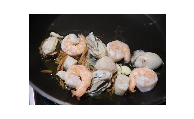 (3)のフライパンに(4)の海鮮を入れ、両面を2~3分焼き、海鮮だけを取り出します。