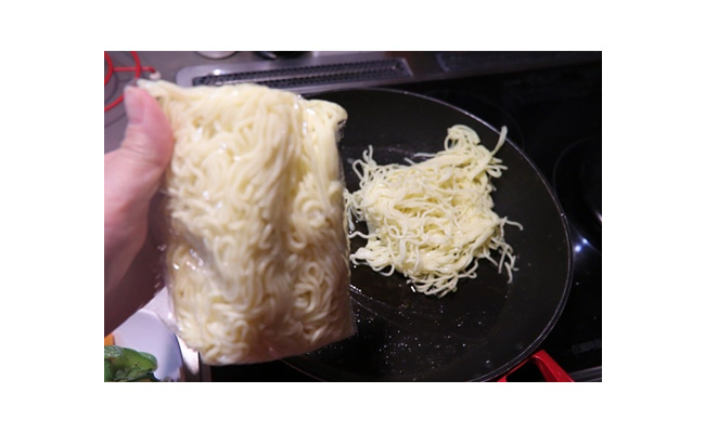 (6)のフライパンから野菜を取り出し、(7)の麺を入れ、10分弱火で炒めます。