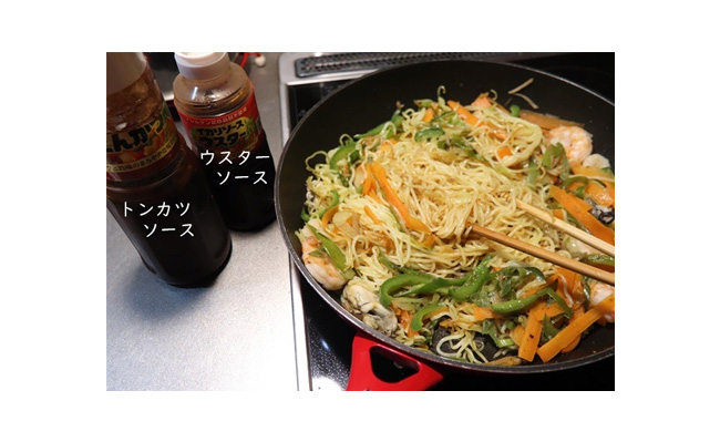 10分経ったら、(5)の海鮮、(8)の取り出した野菜を加え、中火に上げてウスターソース、とんかつソースを加えてよく絡ませます。