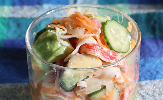 アボカドは縦半分に切り、種を外して皮を剥き、食べやすいサイズにざく切りにします。にんじんは皮を剥き、細めの千切りにします。きゅうりは輪切りに、玉ねぎは繊維に沿って薄切りにします。カニカマは手でほぐします。