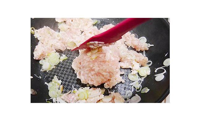 (3)がよい香りになってきたら鶏ひき肉を加え、生色が消えるまで炒めたら、紅しょうが、贅沢ローストだし やすまる(粉末を使用)を加え、しっかりと炒め合わせたら火を止め、お皿などに取り出しておきます。