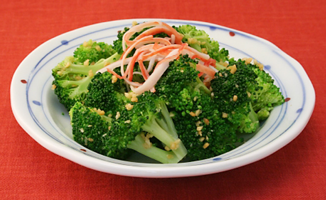 (1)ブロッコリーは小房に分け、塩ゆでします。カニ風味かまぼこは食べやすいように割きます。