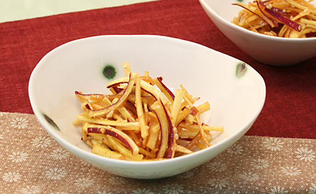 (4)揚げたてのさつまいもを(1)のたれに絡め、器に盛り付けたら完成です。